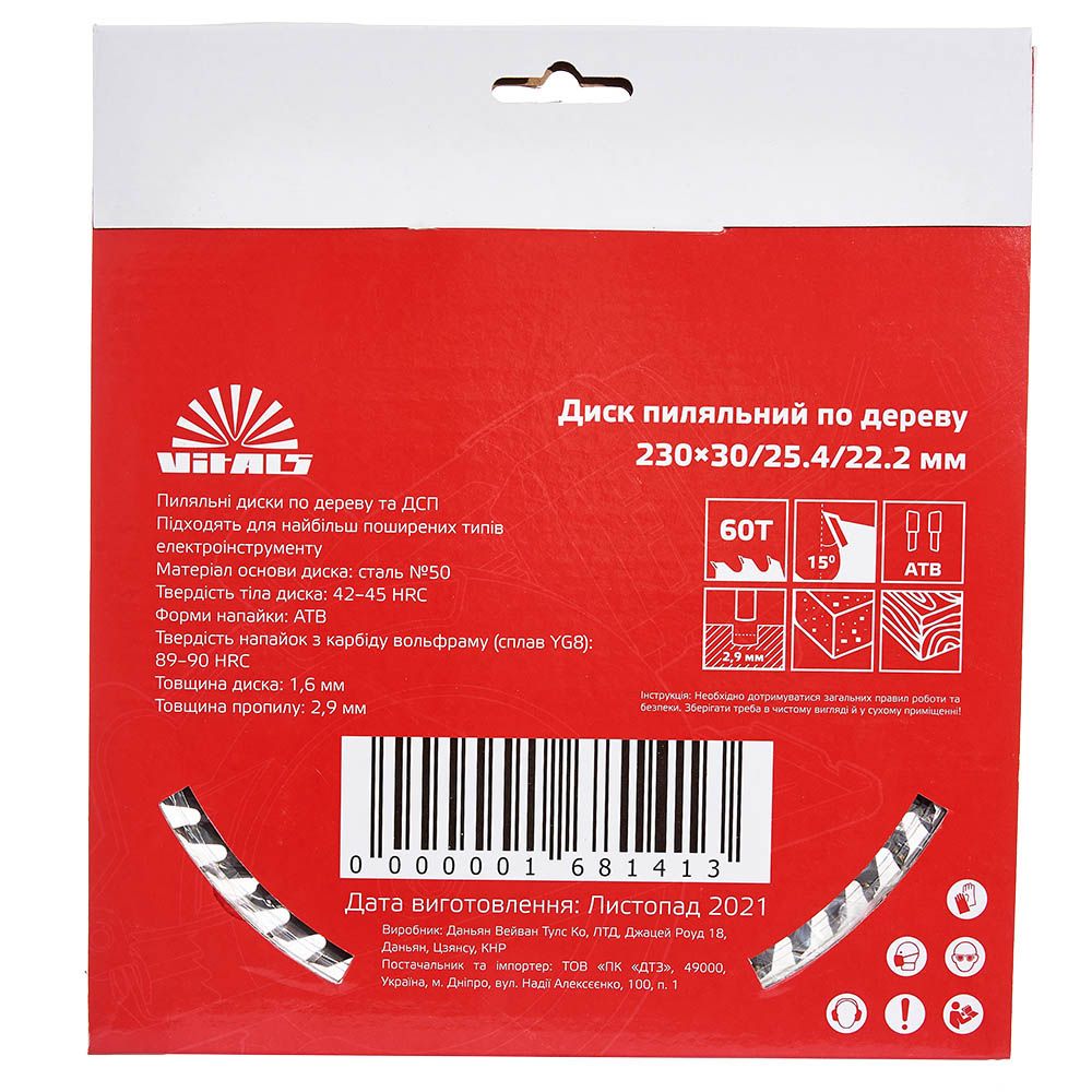 Пиляльний диск Vitals по дереву 230x30/25.4/22.2, ATB 60 підходить для поздовжнього та поперечного розпилу деревини - як м'якої, так і твердої породи, а також ДВП, ДСП.