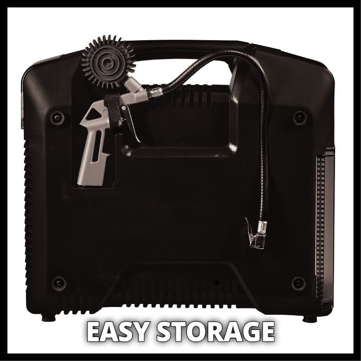 Ергономічний дизайн і практична ручка забезпечують мобільність і зручність транспортування. Безоливний насос, що не потребує обслуговування, потребує незначного обслуговування. Відсік для зберігання стисненого шланга повітря вбудований у корпус. Для адаптерів передбачений додатковий відділ для зберігання. Насадку закачування шин можна зручно розмістити на корпусі.