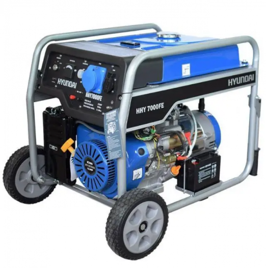 Генератора Hyundai HHY 7000 FEK максимальною потужністю 5,5 кВт має електричний і ручний стартер, великий бак з поплавком для більш тривалої роботи, чотиристоронню раму для кращого захисту і стабілізатор напруги - AVR. Панель управління має 2 розетки (постійний струм 12 В), а система контролю масла - з автоматичним відключенням двигуна. Конструкція компактна, дозволяє зручно переносити за рахунок набору коліс і ергономічних висувних ручок. Аналоговий дисплей показує частоту та напругу та забезпечує кращий контроль. Датчик рівня масла викликає автоматичну зупинку в разі нестачі масла. Він захищений від перевантаження.