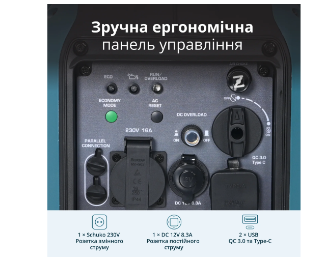 | Комплектація | Генератор, Упаковка, Інструкція, Свічний ключ, Викрутка РН2 6,0 мм, Чохол для аксесуарів, Ключ рожковий 8х10мм, Вилка 230В 16А |