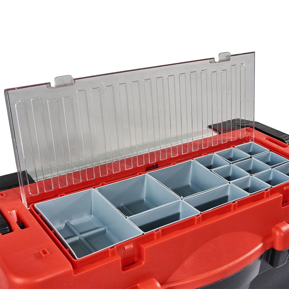 У верхній частині виробу знаходиться органайзер з переставними роздільниками та прозорою кришкою з полікарбонату, яку надійно утримують і не дають випадково розкритися металеві замки високої якості. Наявність органайзерів допомагає систематизувати зберігання дрібних деталей та витратних матеріалів: цвяхів, шайб, гайок, свердел та багато іншого. Є переносний знімний лоток для інструментів з гніздами для біт.