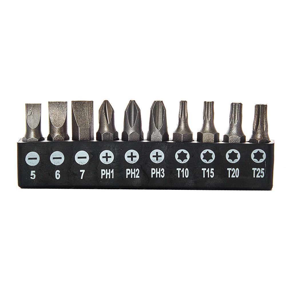 До комплекту входить 10 біт, які виготовлені із міцної Cr-V сталі, яка відома своєю надійністю та витривалістю. У складі цієї сталі присутні хром та ванадій, які надають виробу високу стійкість до зносу. Також сталь відрізняється довговічністю і не схильна до тендітного руйнування.