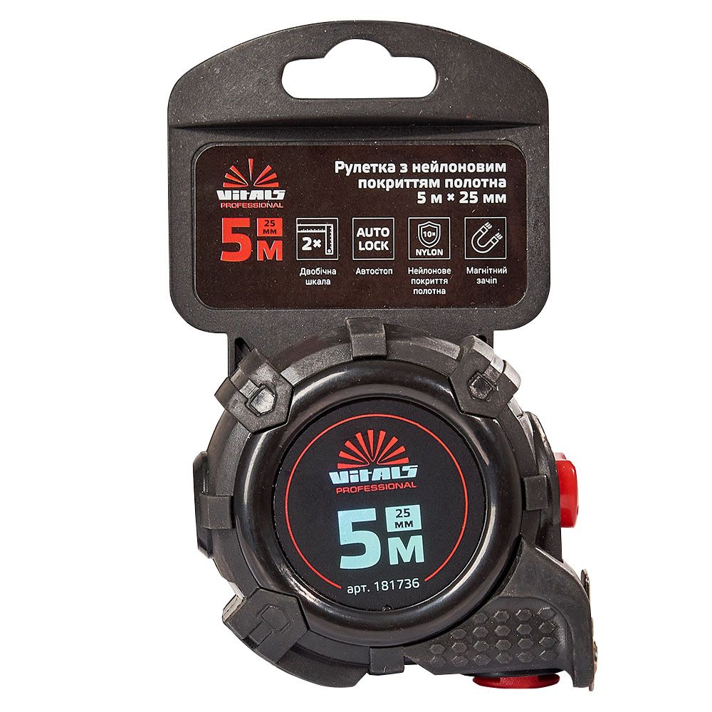 Вимірювальна рулетка гумова з нейлоновим покриттям полотна 5 м × 25 мм автостоп Vitals Professional призначена для вимірювання довжини під час проведення будівельних або ремонтних робіт.