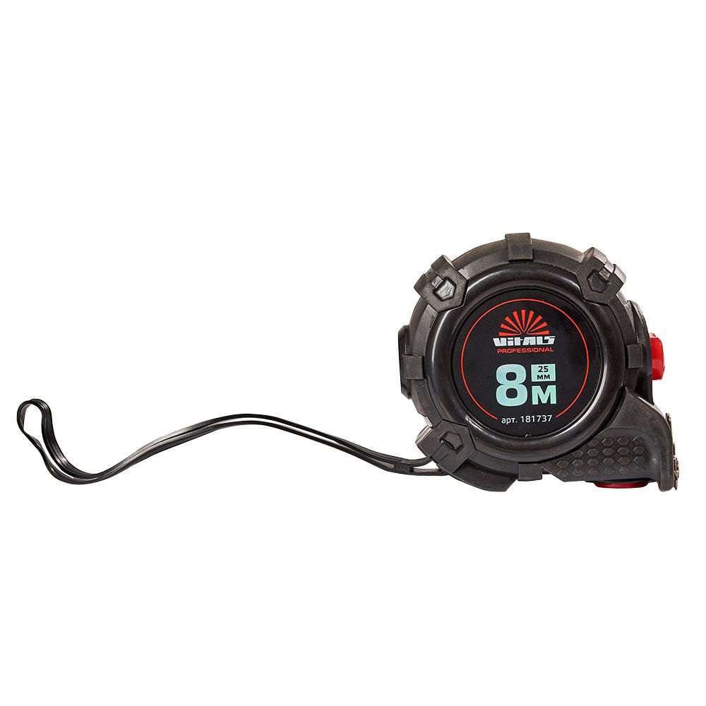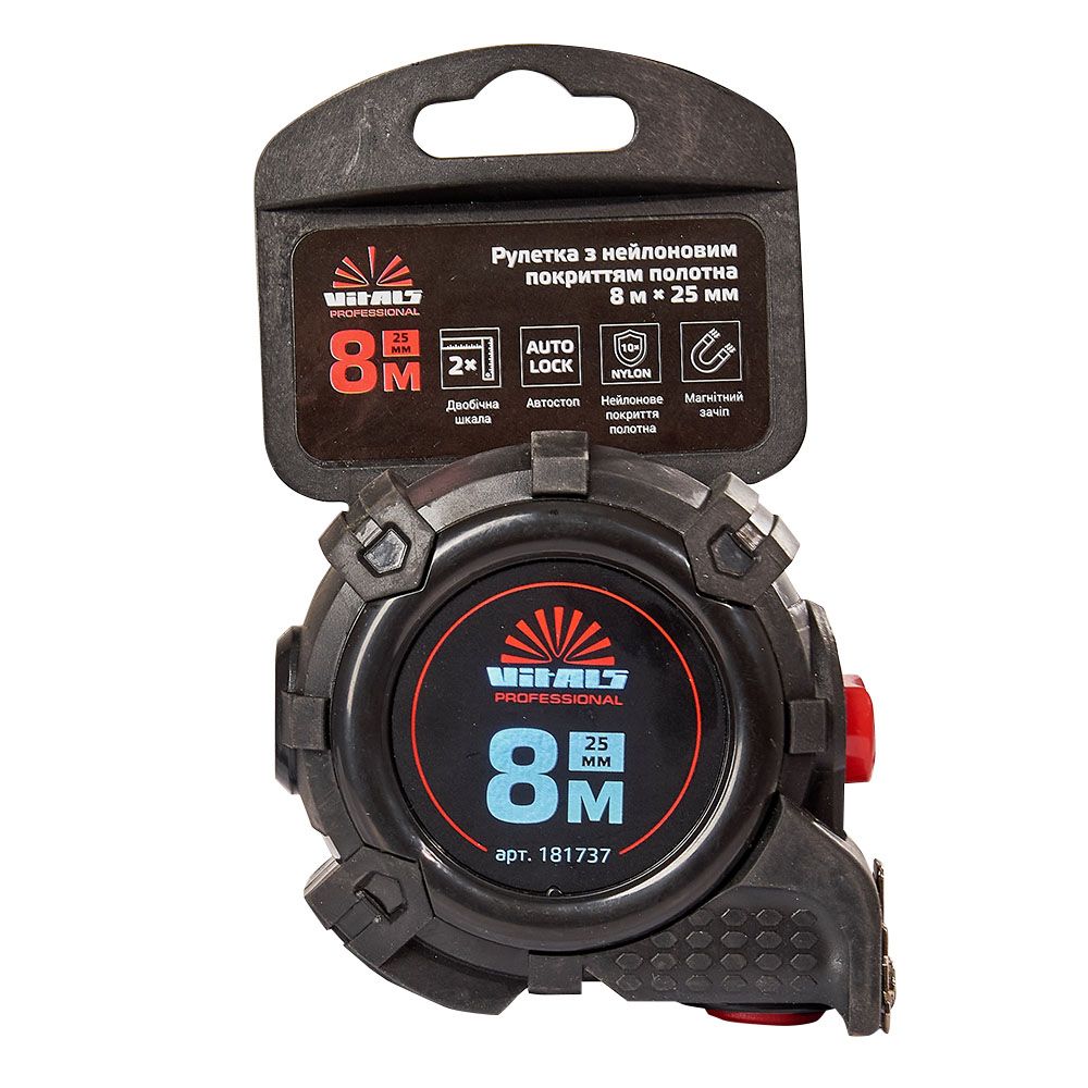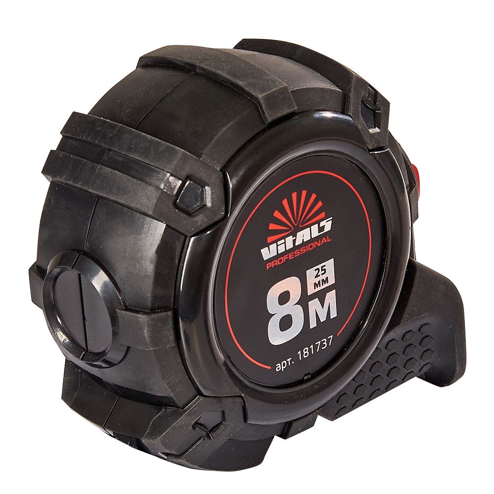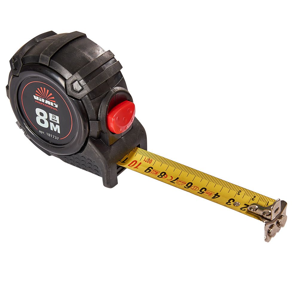Вимірювальна рулетка гумова з нейлоновим покриттям полотна 8 м × 25 мм автостоп Vitals Professional призначена для вимірювання довжини під час проведення будівельних або ремонтних робіт.