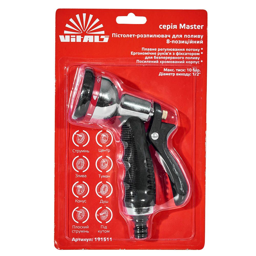 Пістолет-розпилювач восьмипозиційний хромований металевий Vitals Master призначений для поливу рослин при підключенні до водопровідного шлангу за допомогою конектора ½".
