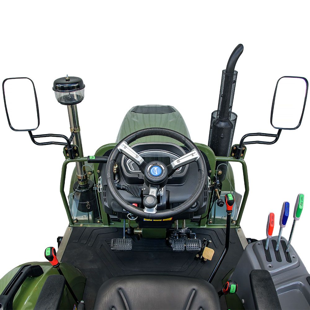 Механічна шестеренчаста трансмісія з комбінацією передач (4×2)+(4×2) та окремою реверсивною коробкою забезпечує маневровість та універсальність. Дводискове зчеплення забезпечує плавне передавання потужності. Повний привод 4×4, гідрооб’ємне кермування з окремим насосом, роздільні педалі гальм із можливістю синхронізації — усе це забезпечує контроль та надійність на будь-якому покритті.