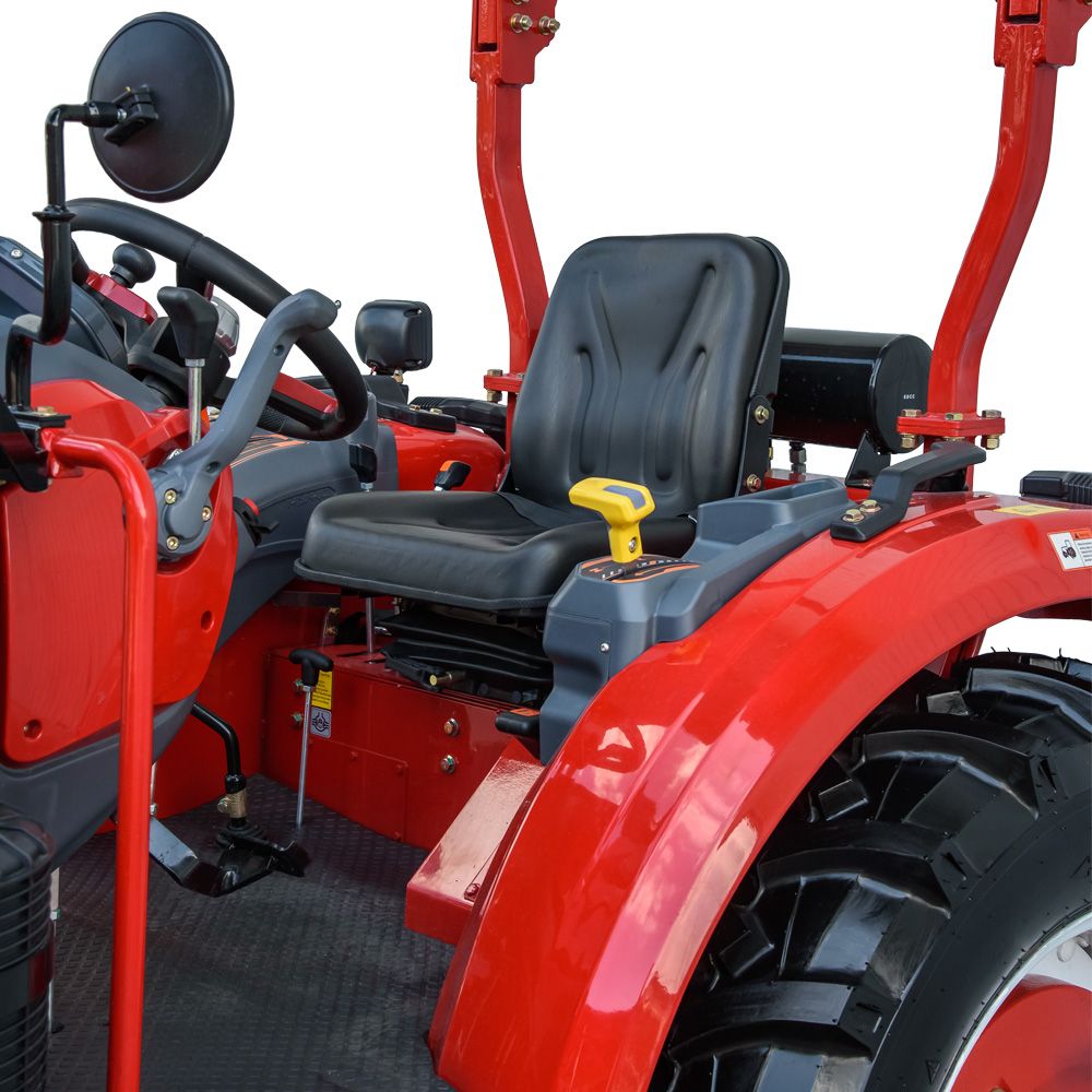 Трактор обладнаний ергономічним сидінням з амортизатором, підлокітниками та регулюванням за відстанню. Панель приладів — багатофункціональна, з цифровими індикаторами. Є рівна підлога, магнітола, електророзетка для причепа та базовий комплект світлотехніки (фари, покажчики поворотів, габарити, сигналізація). Кабіна відсутня, але базова комплектація передбачає все необхідне для роботи у помірних погодних умовах.