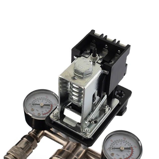 Прессостат в сборе или реле давления (блок управления), предназначен для контроля давления в ресивере компрессора по заданным параметрам в полностью автоматическом режиме. Используется для трехфазных поршневых воздушных компрессоров с напряжением 380В и максимальной мощностью до 3 кВт.