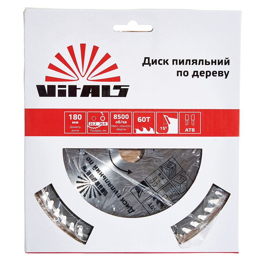Пиляльний диск Vitals по дереву 180x22.2/20, ATB 60 підходить для поздовжнього та поперечного розпилу деревини - як м'якої, так і твердої породи, а також ДВП, ДСП.