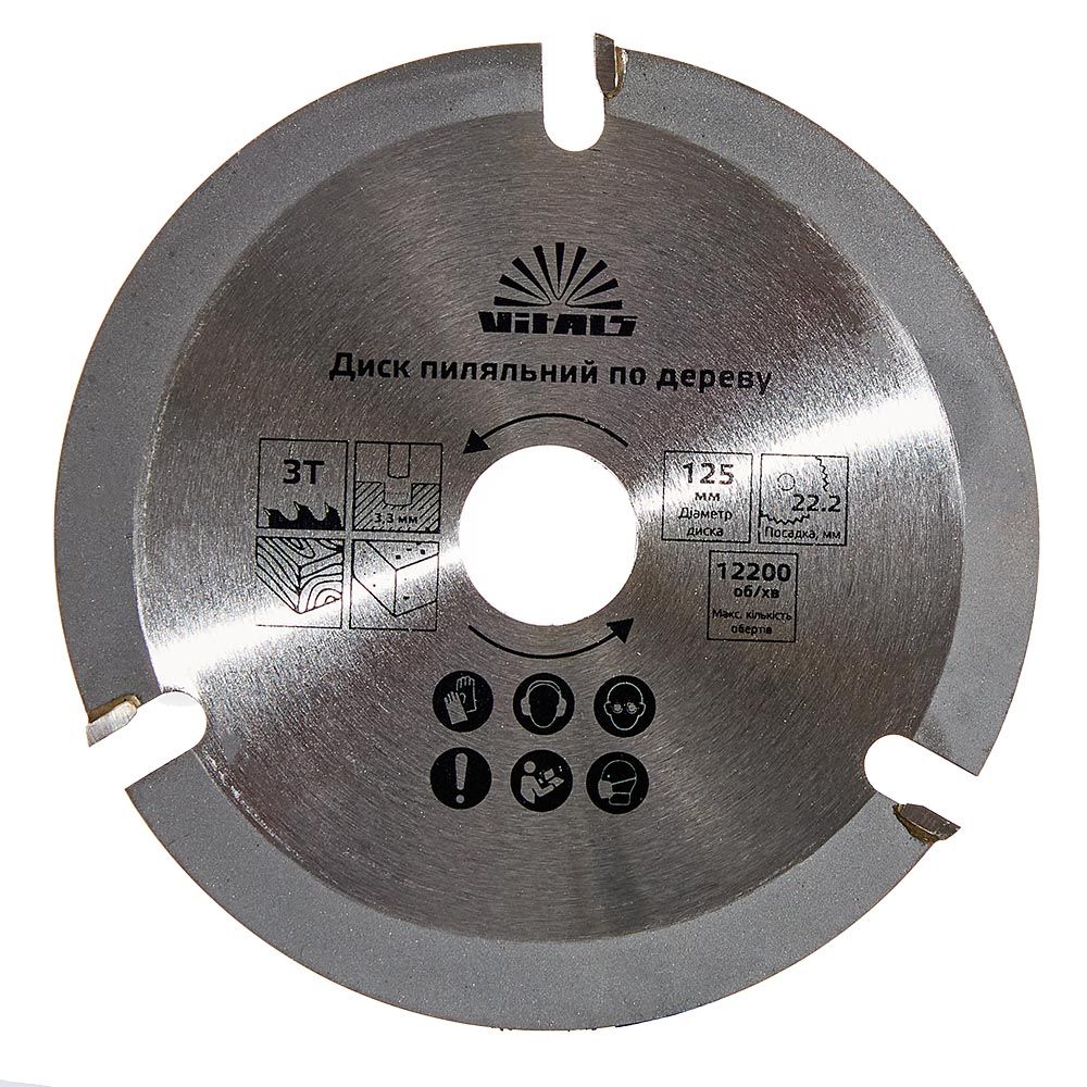 Диск пиляльний Vitals по дереву 125x22.2, 3Т - це унікальний трьохзубий пиловий диск, спеціально розроблений для роботи з високооборотистими кутовими шлифмашинами (КШМ).