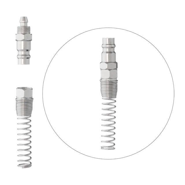 Ответная часть для быстросъемного соединения с пружиной используется для установки на спиральные и прямые воздушные шланги, чтобы обеспечить быстрое подключение пневмоинструмента к компрессору или воздушной магистрали. Также их используют для ремонта шлангов с повреждениями и для заменены вышедших из строя коннекторов.
