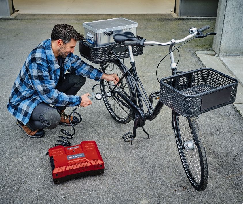 Акумуляторний компресор — це невеликий, але потужний помічник для застосувань із тиском максимум 8 барів. Це робить його придатним, наприклад, для швидкого закачування шин велосипедів, автомобілів і мотоциклів. Навіть вибагливі шини для шосейних велосипедів не створюють жодних проблем для акумуляторного компресора завдяки потужному насосу.