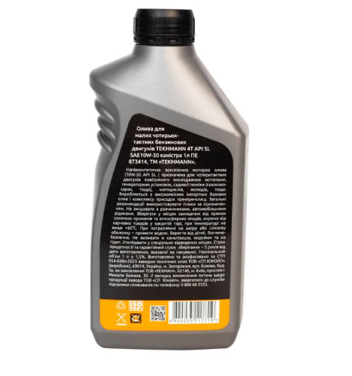 Виробляється олія ТЕКHMANN 4Т API SL SAE10W з високоякісних імпортних базових олив і комплексу присадок преміум-класу, відповідає сучасним вимогам з екології та енергозбереження.