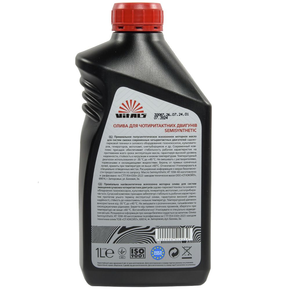 Преміальна напівсинтетична всесезонна моторна олива Vitals™ призначене для систем змащування сучасних чотиритактних двигунів садово-паркової техніки та силового обладнання: газонокосарок, культиваторів, генераторів, мотопомп, снігоприбиральніків та інше.