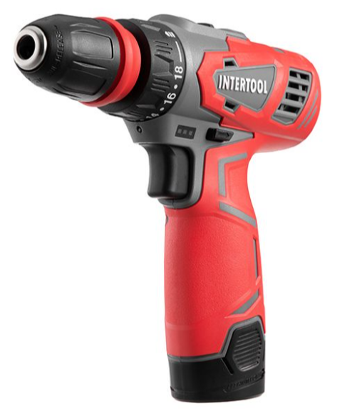 Дрель-шуруповерт аккумуляторная 12 В, 30 Nm, 0-350/0-1300 об/мин, 0.8-10 мм, литий-ион, 1.5 Ач, съемный патрон INTERTOOL DT-0314