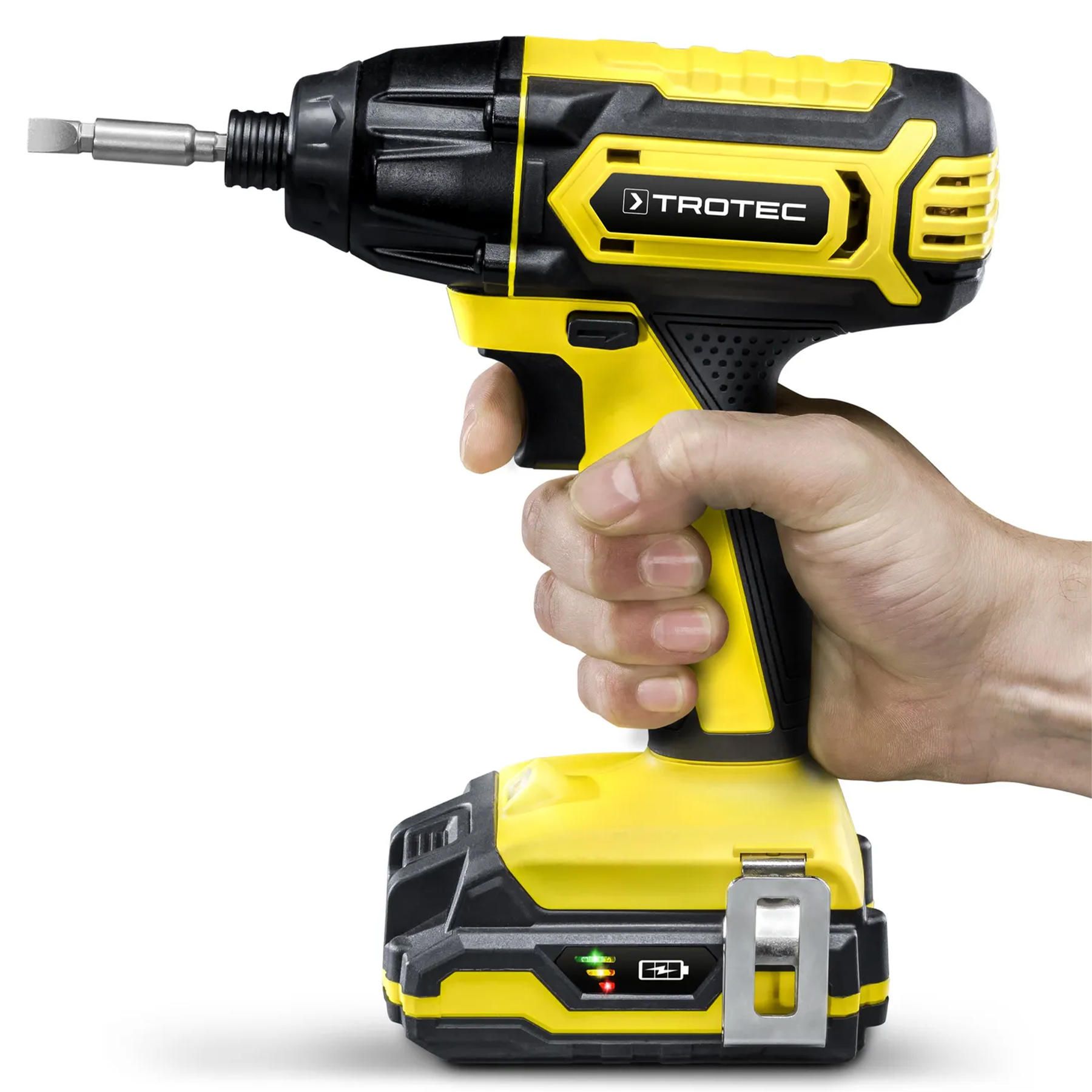 Всюди, де звичайні акумуляторні шурупокрути досягають меж продуктивності, потужний акумуляторний імпульсний (ударний) гайковерт PIDS 10-20V продовжує виконувати роботу за допомогою потужної акумуляторної батареї FlexPower, крутному моменту 180 Нм та тангенціальним ударам зі швидкістю 3600 уд/хв. Шестигранний тримач для інструменту ¼ дюйма 6,35 мм та подовжувачі-адаптери, що йдуть в комплекті, дозволяють гнучко використовувати стандартні біти та торцеві головки з квадратним кінцевиком. Це робить компактний імпульсний (ударний) гвинтоверт Trotec PIDS 10-20V універсальним бездротовим пристроєм для закручування довгих шурупів, розкручування заржавілих гайко-гвинтових з'єднань та навіть для свердління отворів.