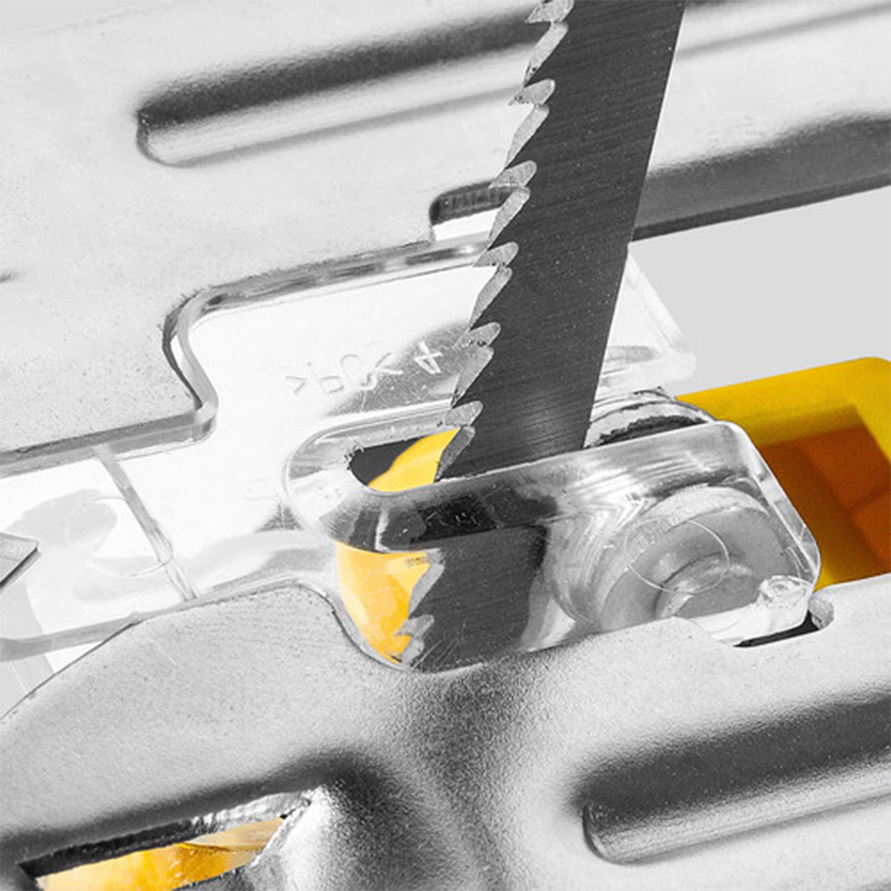 Швидкозажимний патрон дозволяє замінити пиляльне полотно без додаткових інструментів всього за кілька секунд. У разі косих різів алюмінієву підошву можна повертати до 45° в обидва боки із кроком 15°, а для захисту делікатних деталей можна прикріпити пластиковий ковзний башмак, що входить у комплект. Захисний прозорий пластиковий екран та механізм блокування випадкового увімкнення також сприяють безпечній роботі з цим електролобзиком.