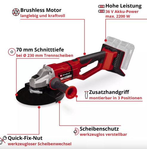 Акумуляторна кутова шліфмашина Einhell AXXIO 36/230 Q є членом сімейства PXC і працює від двох 18V акумуляторів (рекомендовано: 3,0 Ah або вищий). Технологія TWIN-PACK та безщітковий двигун забезпечують підвищену потужність та тривалий час роботи, а швидкозажимна гайка дозволяє швидко міняти диски без інструментів. Поворотна основна рукоятка, захисний кожух диска з функцією швидкого регулювання, антивібраційна функція та тонкий дизайн з м'якими поверхнями захвату роблять цей інструмент комфортним у використанні. Додаткова рукоятка може бути встановлена в 3 положеннях. Для безпеки передбачено функцію м'якого пуску та захист від запуску, а також акумуляторний захист. Алюмінієвий корпус редуктора та захист від перевантаження сприяють довгому терміну служби. Інструмент поставляється без акумулятора і зарядного пристрою, але він може бути приведений в дію за допомогою широкого асортименту Power X-Change акумуляторів.