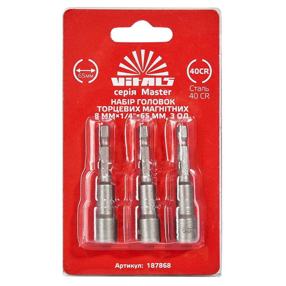 Опис набору головок торцевих магнітних 8 мм 1/4" х65 мм 3 шт Vitals