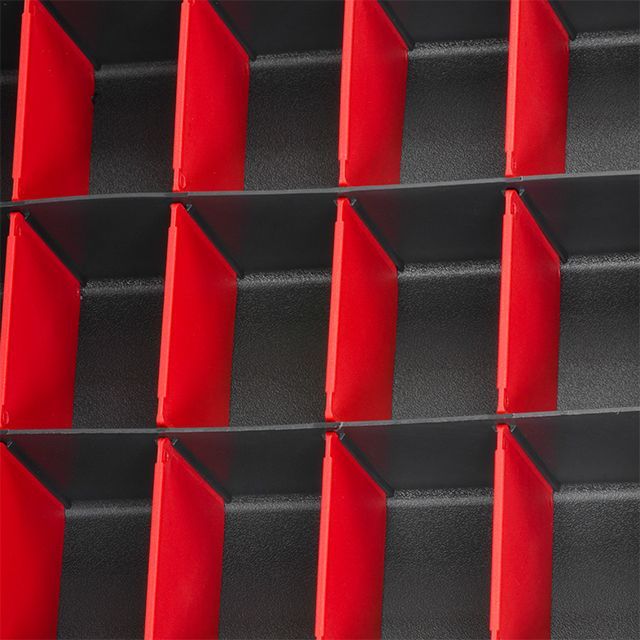 Внутри органайзера предусмотрено 15 ячеек со съемными перегородками для размещения крепежных элементов: метизов, фурнитуры, запчастей, рыболовных принадлежностей и прочих мелочей. При этом размер ячейки можно сформировать самостоятельно, извлекая нужную перегородку.