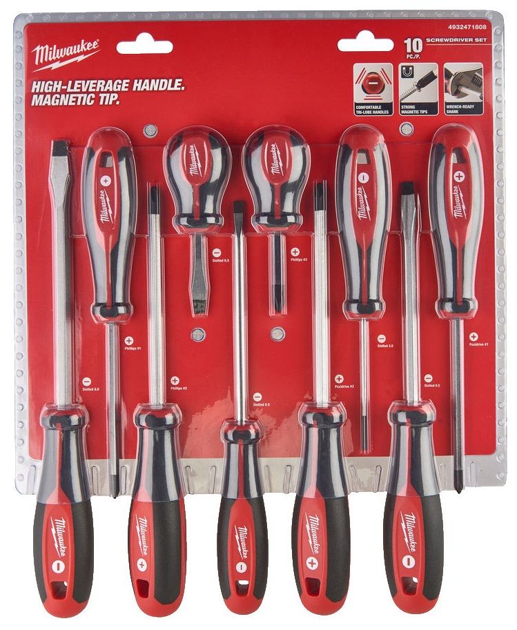 Набор отверток магнитных с трехгранной рукояткой MILWAUKEE, PH/PZ/SL, (10шт) в кейсе