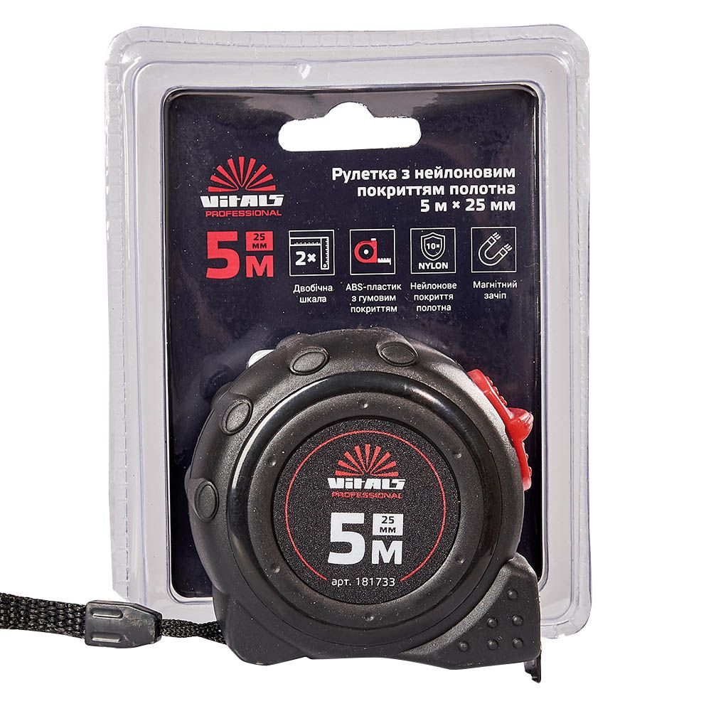 Вимірювальна рулетка гумова з нейлоновим покриттям полотна 5 м × 25 мм Vitals Professional призначена для вимірювання довжини під час проведення будівельних або ремонтних робіт.