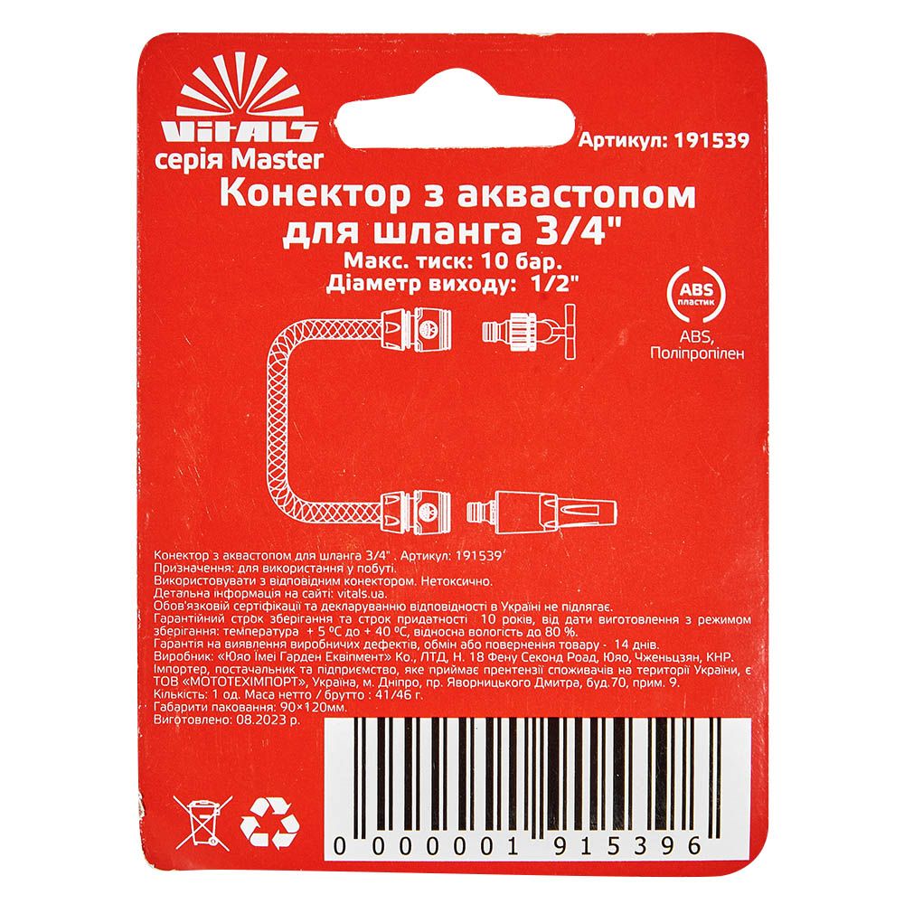 Опис конектора з аквастопом 1/2" для шлангу 3/4" Vitals Master