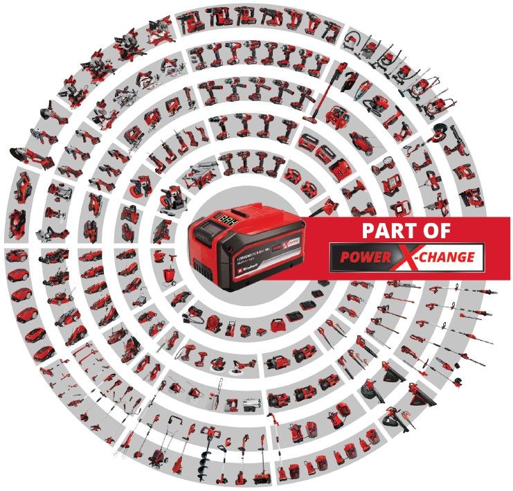 - Система Power X-Change 18V: член універсальної акумуляторної системи Einhell, один акумулятор для понад 200 інструментів серії Power X-Change, економія на додаткових батареях
