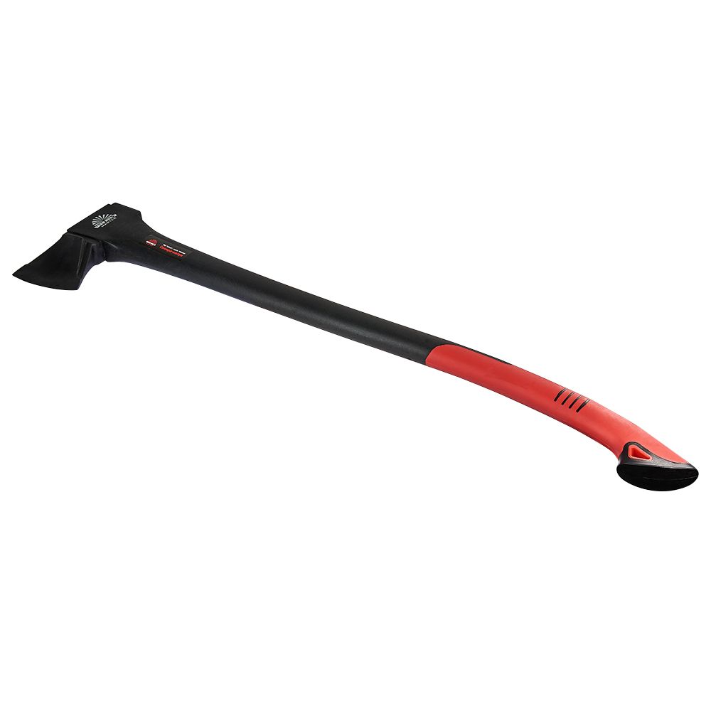 Лезо та руків’я надійно полімеризовані, що унеможливлює люфт навіть за великого ударного навантаження. Завдяки конструкції та компактним габаритам інструмент зручний для транспортування й легко вміщується в багажник автомобіля. Чохол із щільного пластику захищає від випадкових порізів.