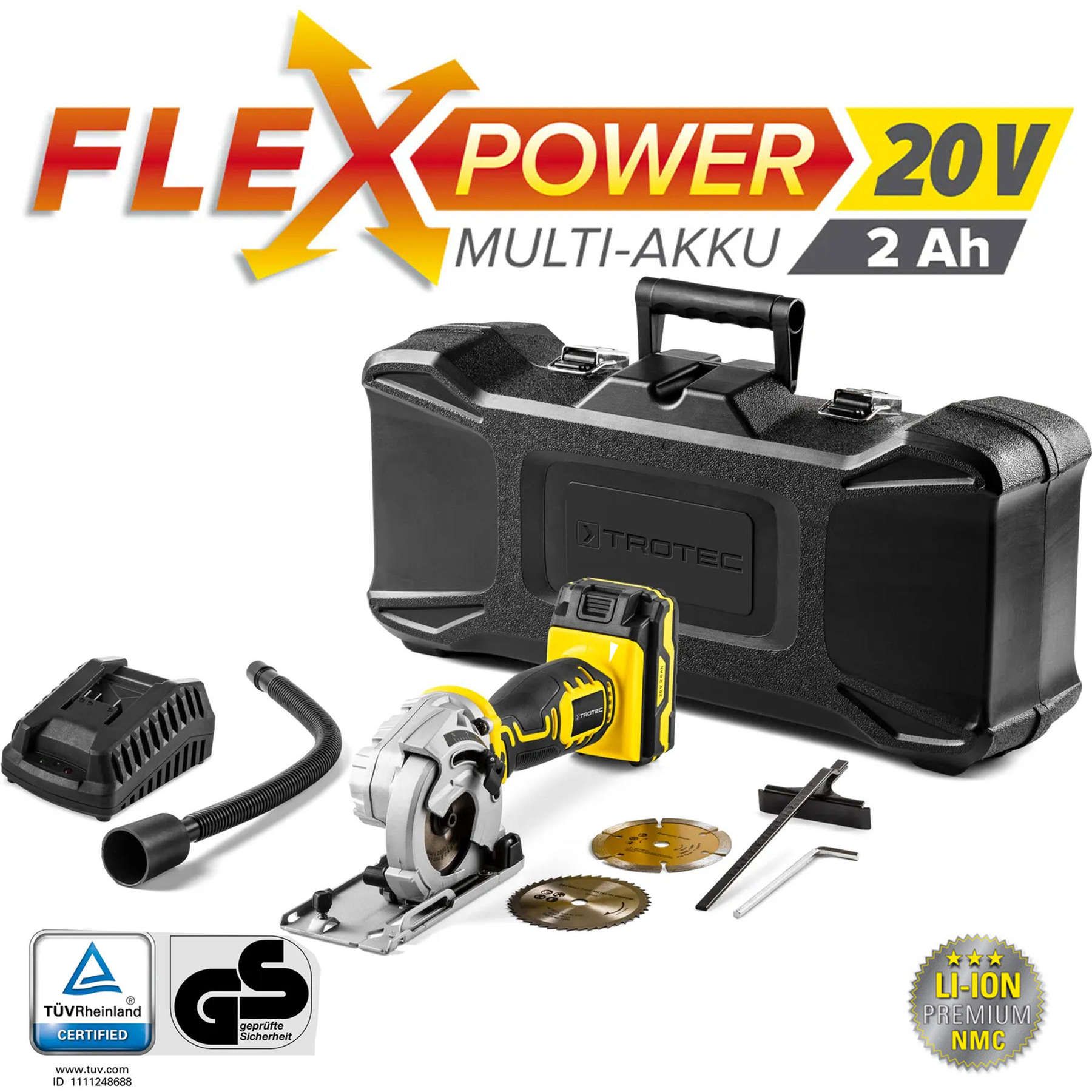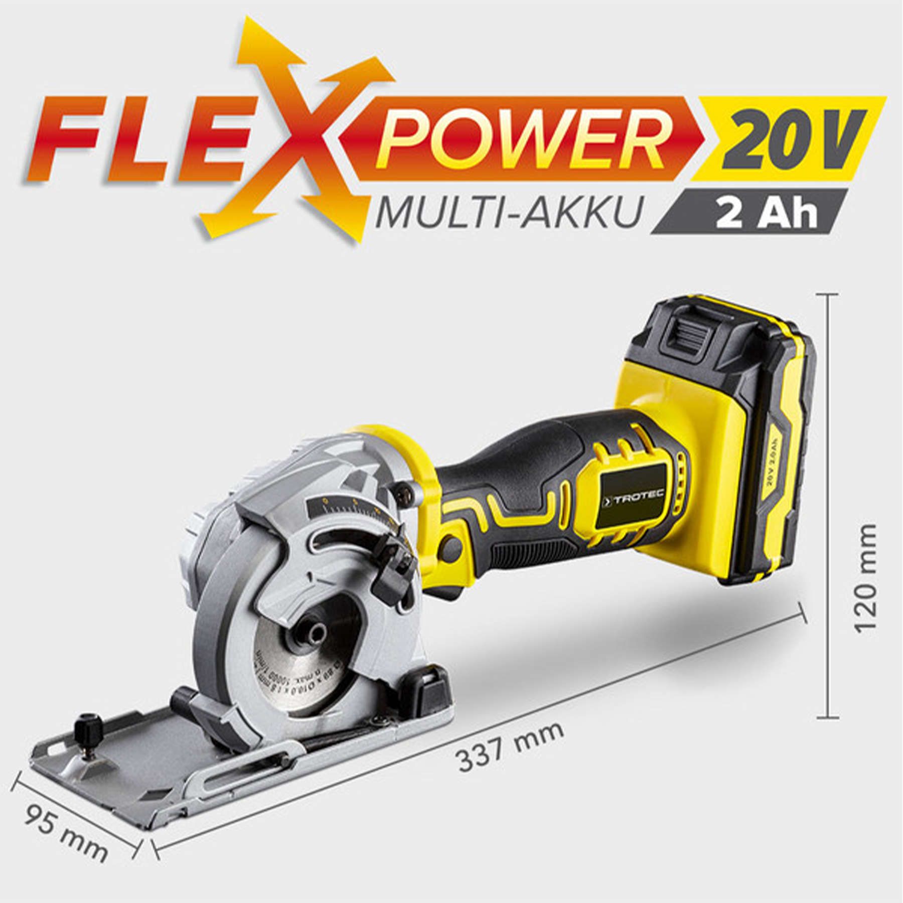 Потужна акумуляторна батарея MultiFlex 20 В слайдерного типу не має ані ефекту пам’яті, ані саморозряду завдяки літій-іонній технології, і її можна повністю зарядити менш ніж за годину за допомогою зарядного пристрою з функцією швидкого заряду, що входить у комплект. А головне, що завдяки концепції Trotec FlexPower батарею можна використовувати для багатьох інших електроінструментів Trotec.